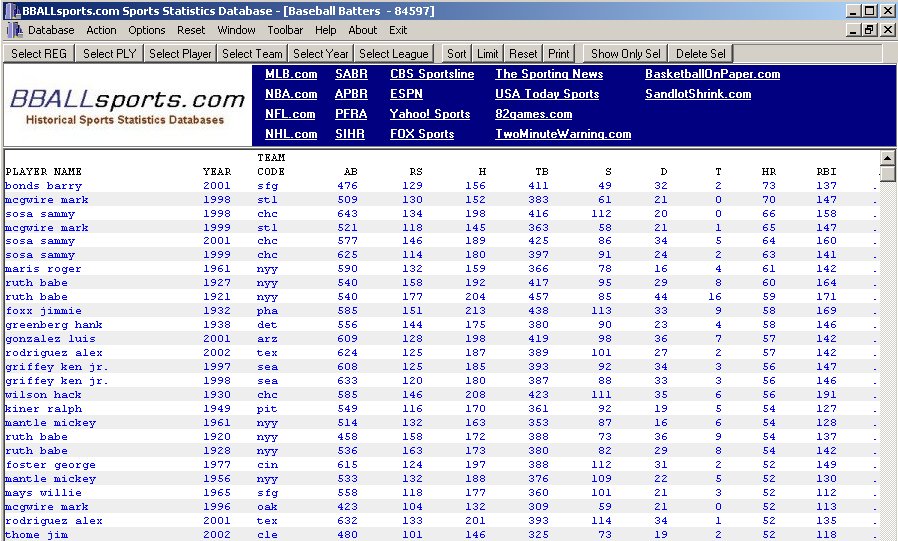 Free download. Get all four sports in one database. Click here to download the new SuperDB (25 Megs) See screenshot below.